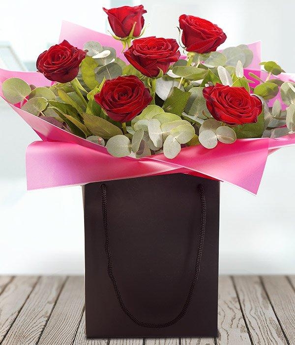 A passionate bouquet containing 6 of the highest quality red roses, shown endearingly in an aquapack gift bag.